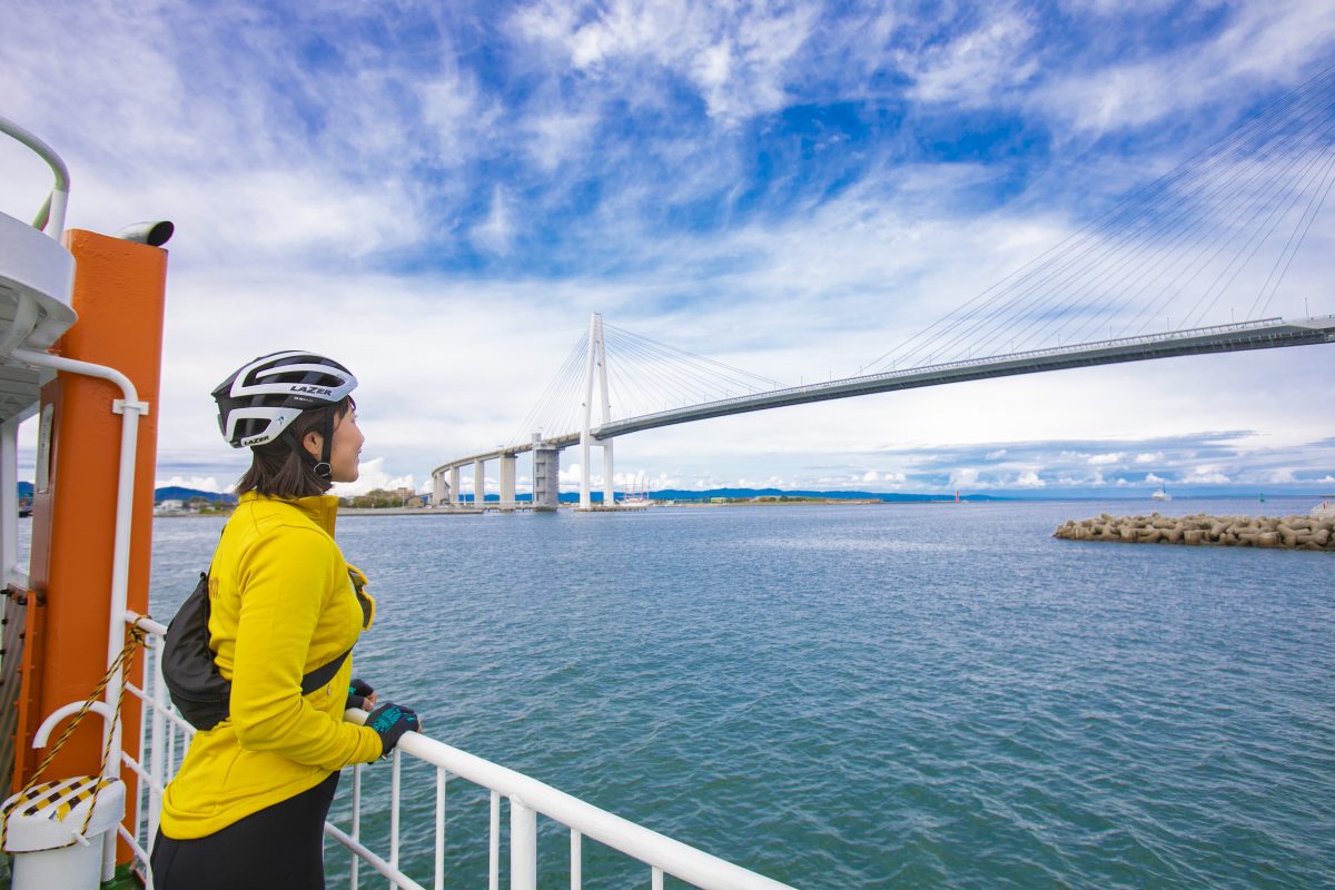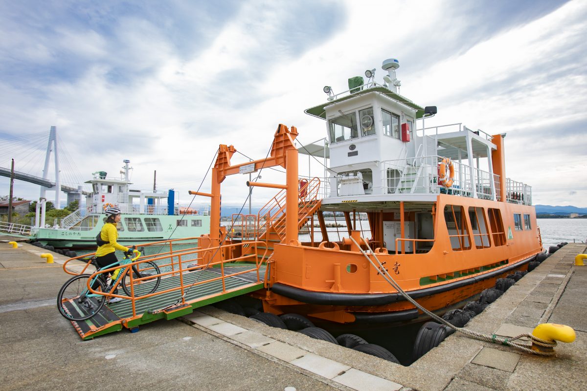 地元住民の足として運航されており、自転車を持ち込むことができる。乗船は無料で予約も不要。「ここでレトロな船に乗るっていう非日常感が楽しい! 旅感が増しますね!」とmizuさんも大はしゃぎ。