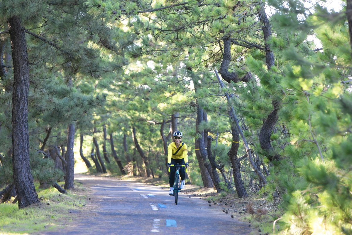 全国的にも珍しい松並木のトンネルを走るサイクリングロード。美しい松並木越しに海を眺めながら快適・安全な走行が楽しめる。