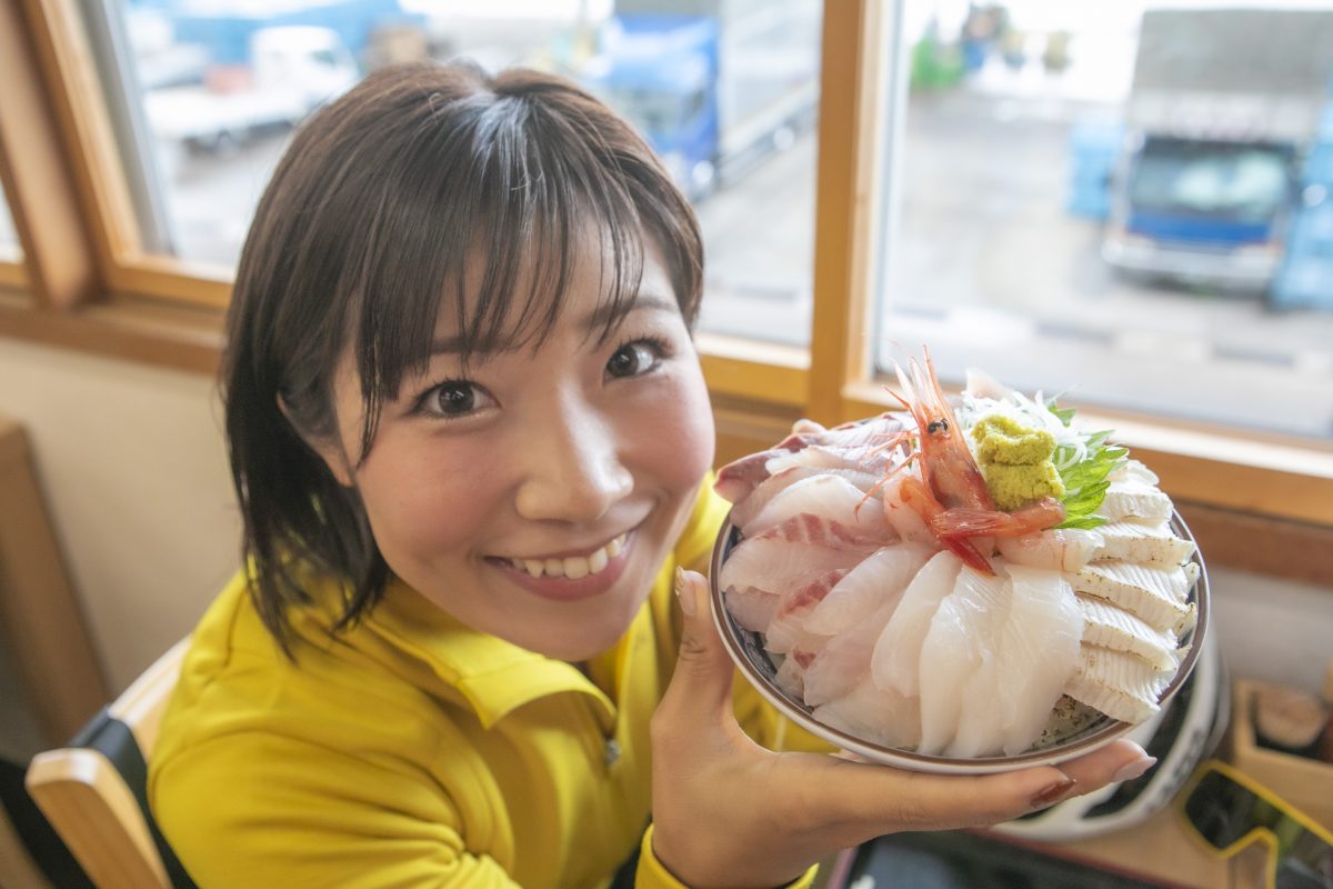 早朝6時からやっている、漁港の中にある食堂。早く行くとセリの様子も見られる。Mizuさんが選んだのは氷見浜丼のはんさ盛り。はんさは氷見の言葉で「たくさん!」的な意味。いわばメガ盛り。2520円でメジナ、フクラギ、テッポウサワラのあぶり、コショウダイが山のように!