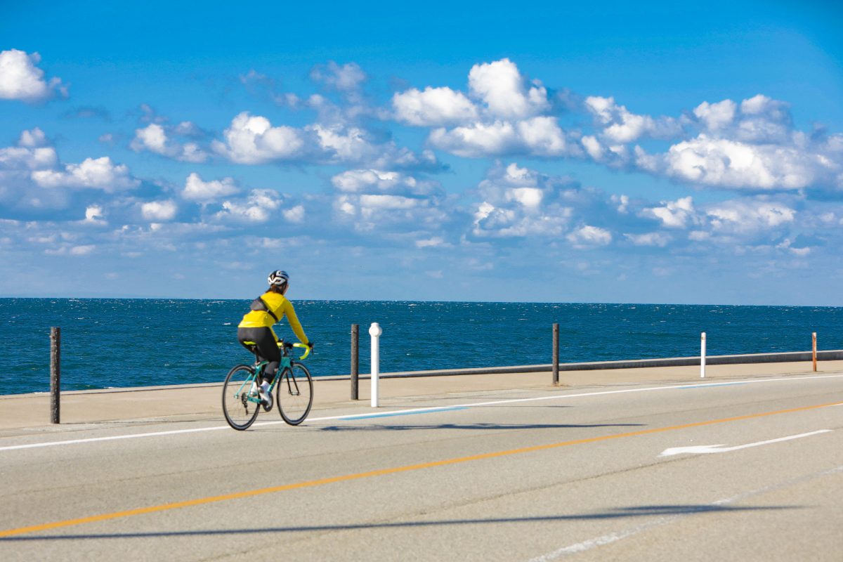 富山湾岸サイクリングコースは、美しい富山湾をぐるっと囲むような形で設定されている。そして富山県が誇る絶景といえば「海越しの立山連峰」だ。そびえたつ北アルプスの山々を、富山湾の青い海の向こうに眺めるその雄大な景観は、息をのむ美しさ。