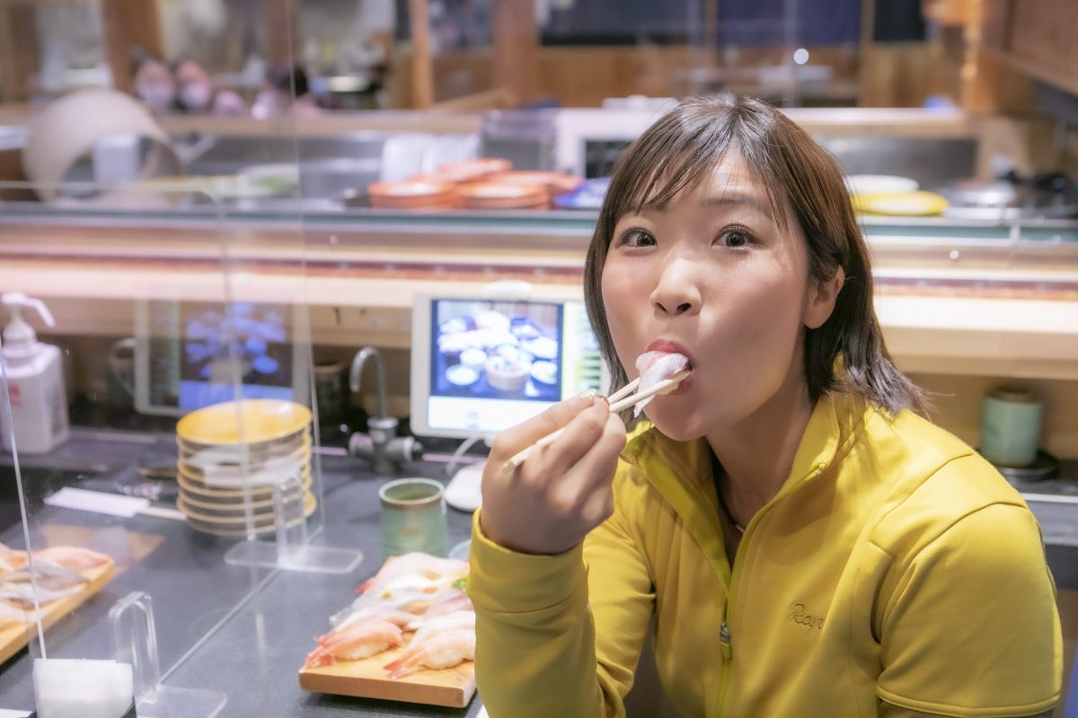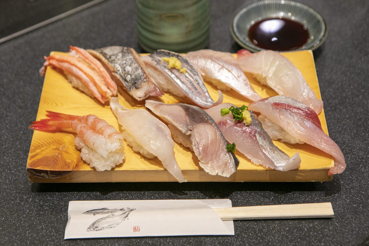 氷見漁港近くにある観光拠点。各種名物フードが楽しめるほか、足湯もサイクリストに人気。「廻鮮氷見前寿し」の「氷見前10貫盛り」はカマス、タチウオ、マダイ、甘エビ、フグなど「氷見前」てんこ盛りで1936円。