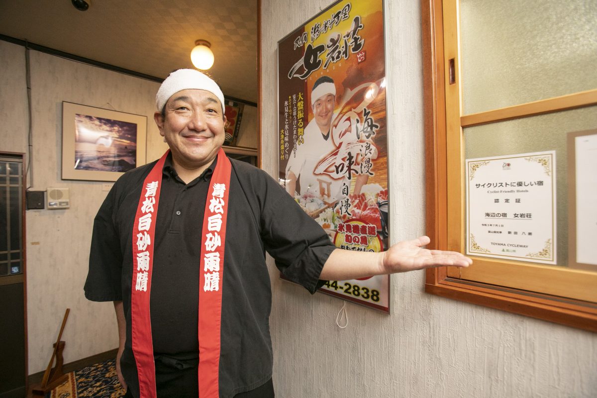 富山県が力を入れている「サイクリストに優しい宿」事業。工具や空気入れを常備しているほか、自転車の部屋への持ち込みが可能、または専用の安全な駐輪場所を備えるなど、安心して泊まれる宿となっている。フロントに掲出された認定証が目印だ。