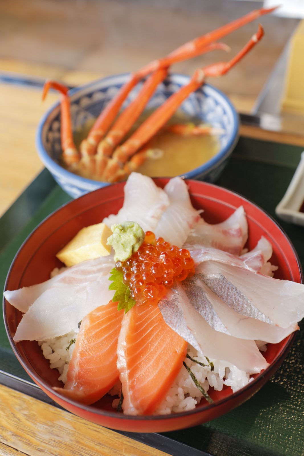 富山湾の海の幸ならここ。レストラン「航海灯」で海鮮丼(1630円)、かにの鉄砲汁(210円)を堪能。名物ラーメンの「富山ブラック」をイメージした醤油風味の富山ブラックサイダー(210円)も試してみて!