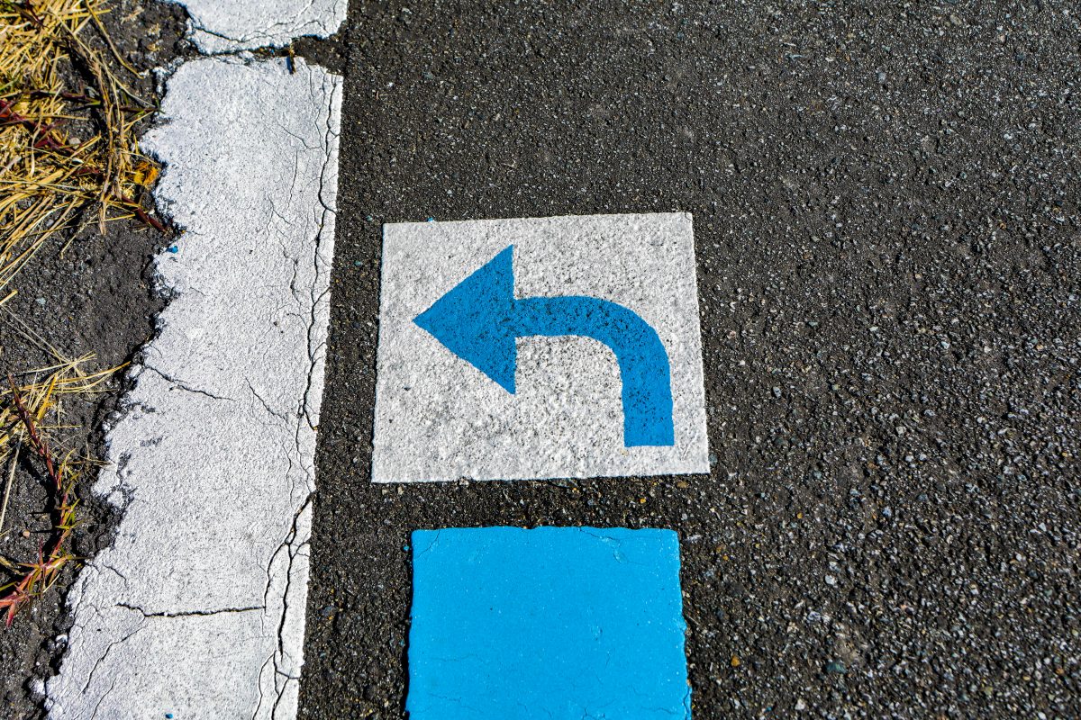 ちなみに富山湾岸サイクリングコースには、mizuさんも絶賛するコースの案内方法が採用されている。ブルーラインが7m間隔で途切れることなく続き、要所要所にはコース分岐点誘導標識が設置され、道に迷う心配がない。右左折箇所には写真のような矢印も表示されている。