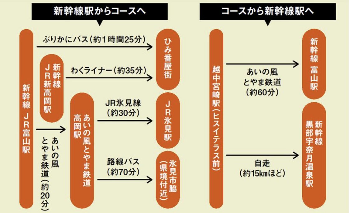 北陸新幹線の停車するJR富山駅、新高岡駅などと、コースのあいだには少し距離がある。ここをどうつなぐかが富山湾岸サイクリングを楽しむポイントとなる。氷見市方面から朝日町方面に走る場合、本誌が推奨するのは以下のような方法だ。スケジュールに合わせて検討しよう。