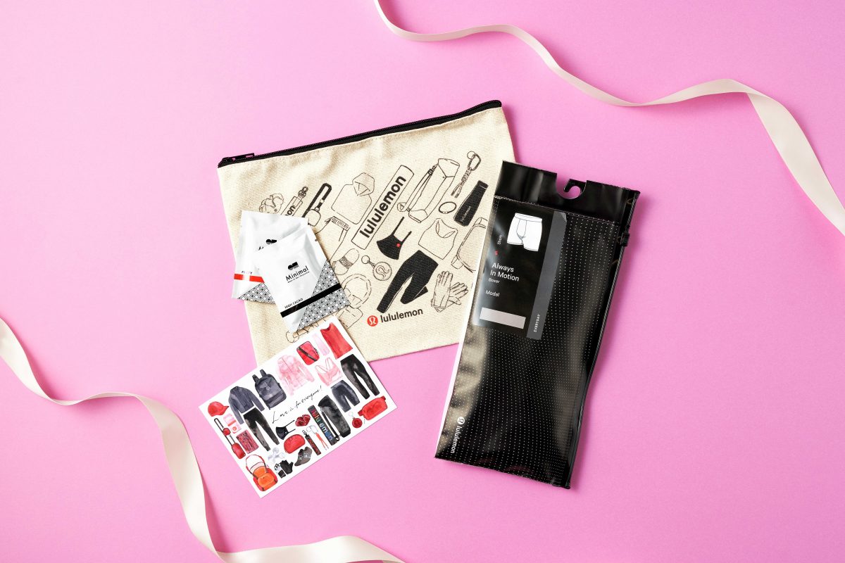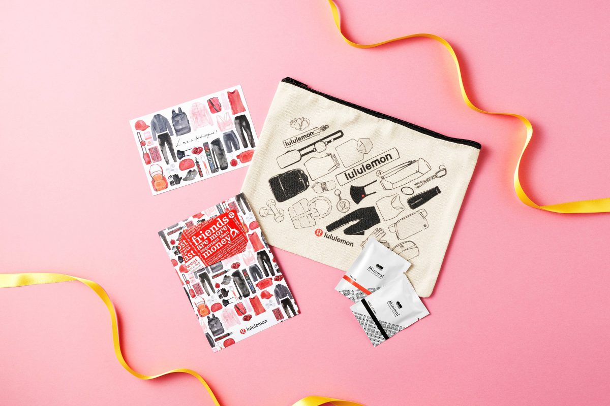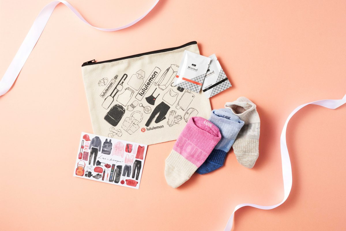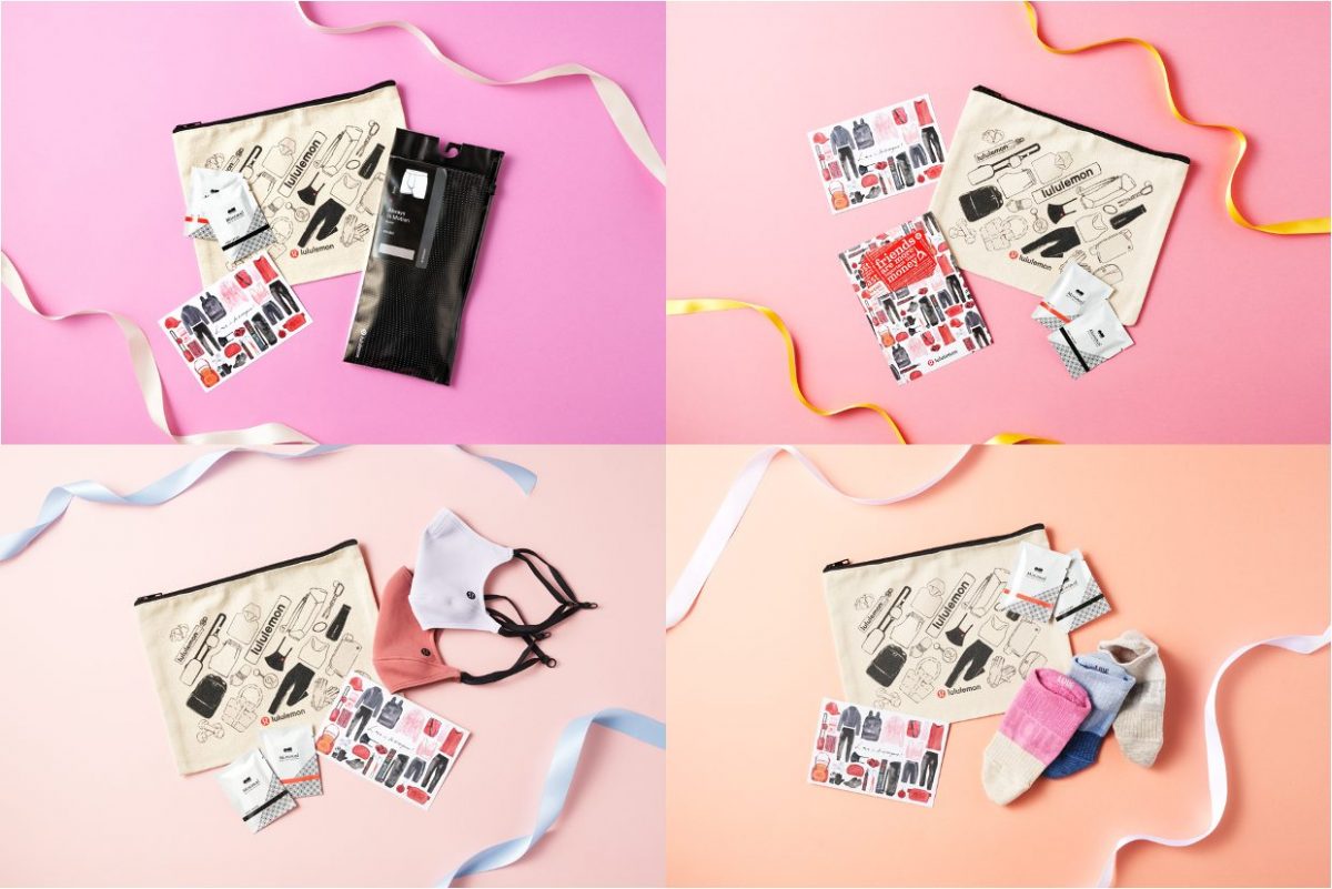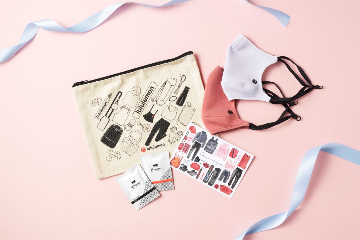 内容:オリジナルポーチ、lululemon Ear Loop Face Mask 2個、Minimalミニチョコレート2枚、オリジナルメッセージカード