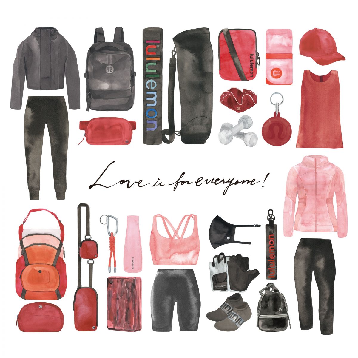 “Love is for everyone”“ルルレモンと過ごす愛ある時間” をテーマにアイテムを描かせて頂きました。家族、⼤切なパートナー、もちろん自分⾝へのプレゼントにも。ルルレモンと一緒に素敵な思い出作りを。