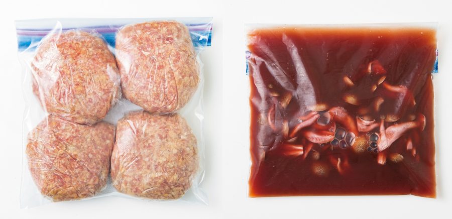 冷凍ミールキットを使えば手の込んだ料理もあっという間! ハンバーグはふわふわの食感。赤ワインを使ったきのこのソースで味に深みが生まれます。ひき肉は冷凍すると粒が一体となり、うまみの濃い、ふんわりしたハンバーグが作れます。玉ねぎも冷凍することでうまみと甘味がアップします。