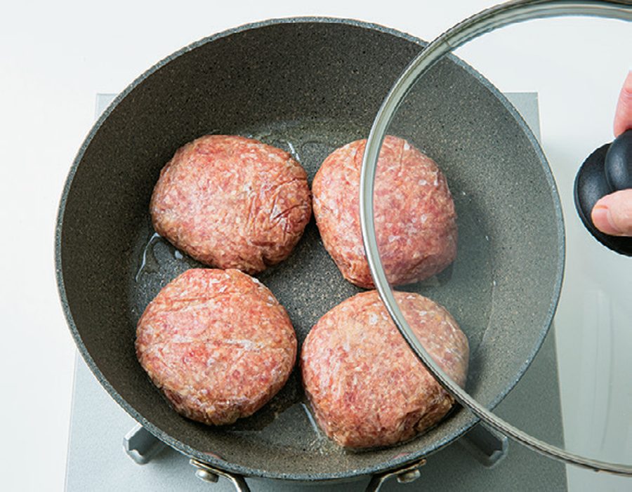 フライパンにサラダ油大さじ1(分量外)を熱し、ハンバーグを入れてふたをし、中火で3分蒸し焼きにする。