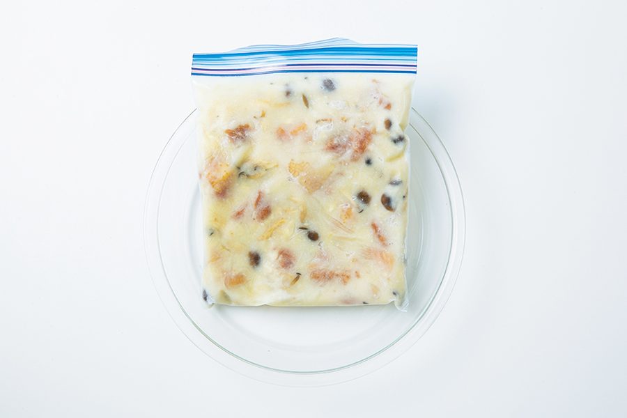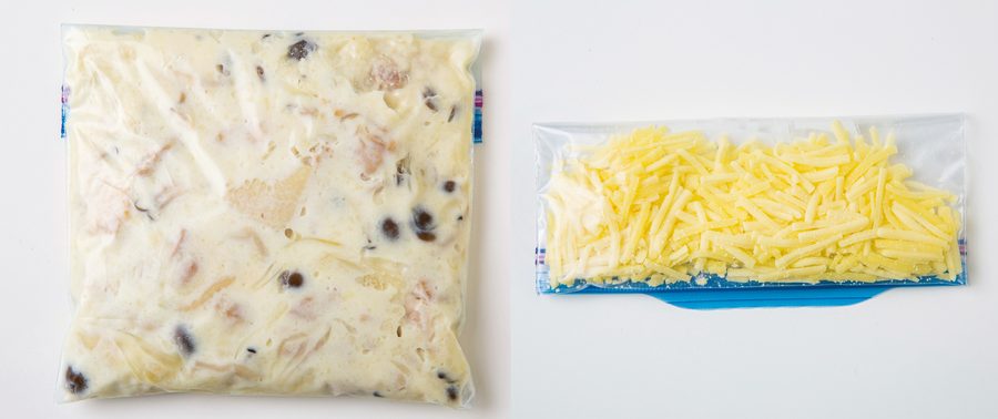 【3】粗熱が取れたら保存袋に入れ、手で押さえて平らにし、空気を抜いて口を閉じ、冷凍する。別の保存袋にチーズを入れ、同様に冷凍する。
