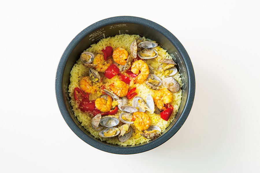 魚介のうまみを吸ったご飯が美味。見た目も華やかでおもてなしにも最適のメニューです。冷凍キットを使った炊き込みパエリアだから、炊飯器まかせでラクラク完成。魚介の臭みが出ないよう、下ごしらえはしっかりと。