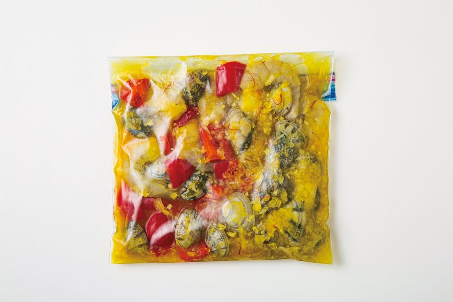 【2】保存袋に【1】とあさり、(A)を入れてもみ込む。手で押さえて平らにし、空気を抜いて口を閉じ、冷凍する。