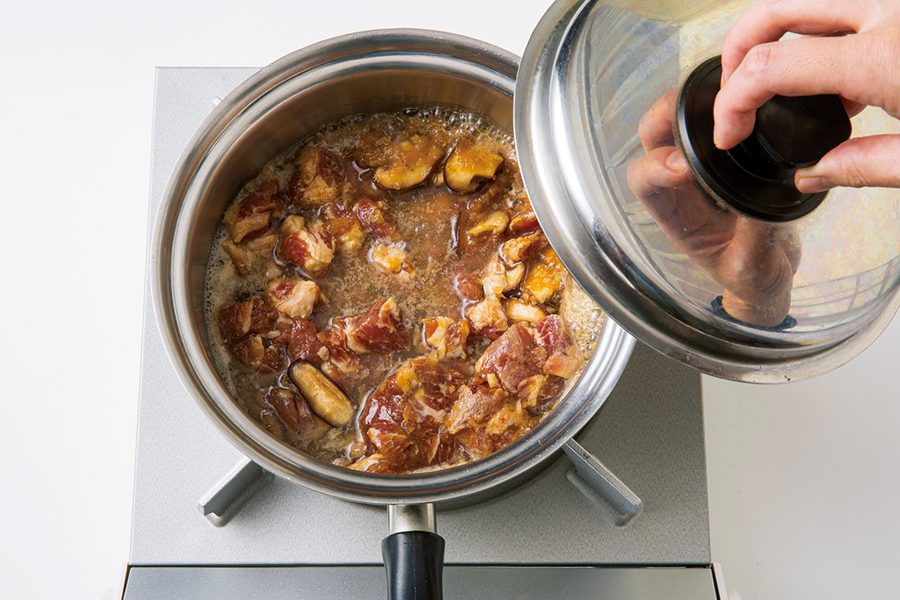 再び沸騰したらアクを取り、ふたをして中火で5分ほど煮る。器に盛ったご飯適量(分量外)にかける。