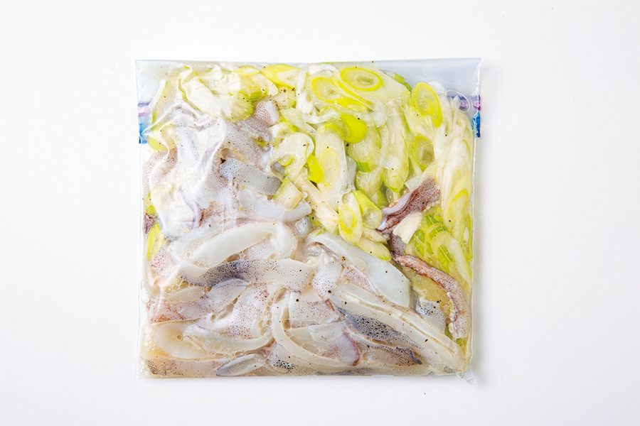 【2】保存袋にいかと(A)を入れてもみ込み、野菜を加え手で押さえて平らにし、空気を抜いて口を閉じ、冷凍する。