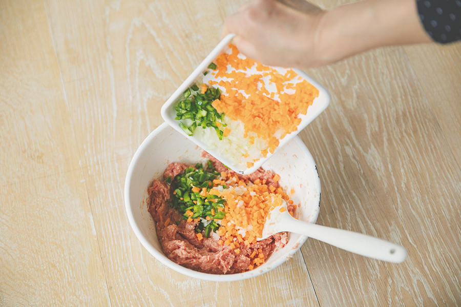 肉だねに生のまま野菜を加えると時短になり、食感も楽しめます。手の熱が伝わらないようにへらを使います。