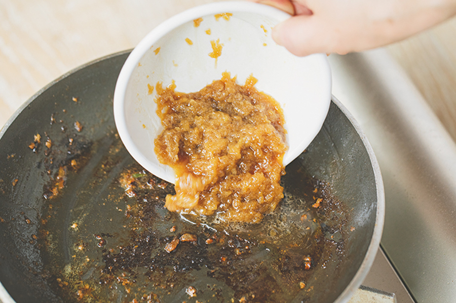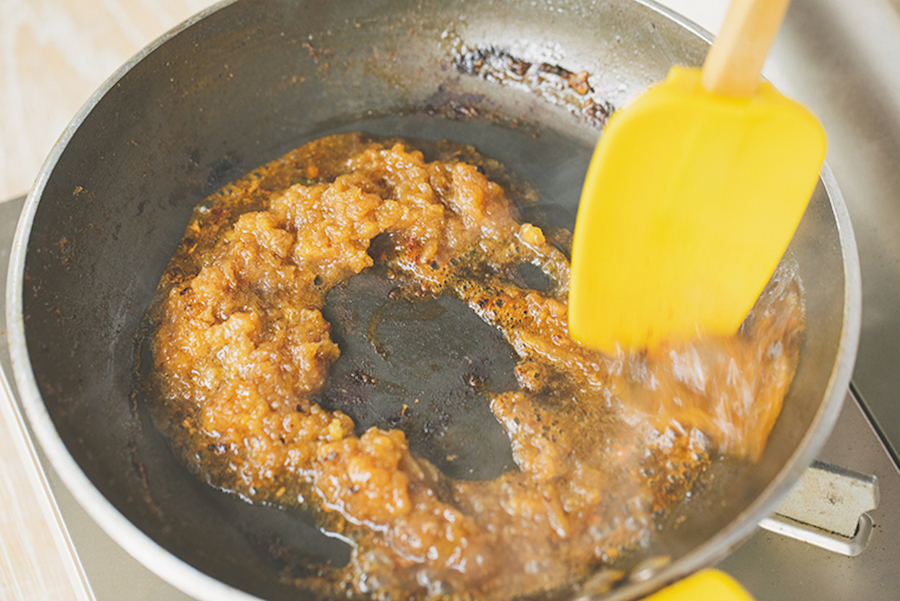 ハンバーグを焼いたフライパンにソースの材料を加え、残った肉のうまみを煮溶かしながら混ぜます。