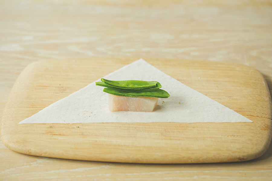 春巻きの皮を三角形の長辺を前にして置き、手前にかじきをのせ、絹さやを上に重ねます。