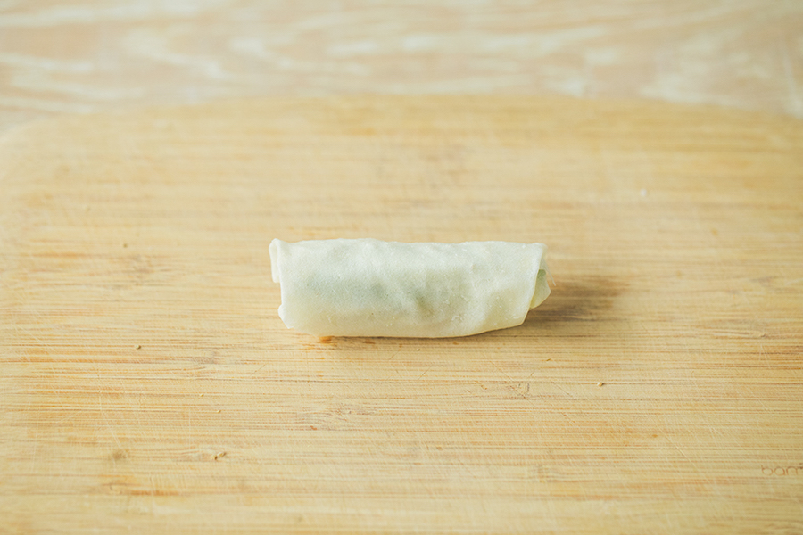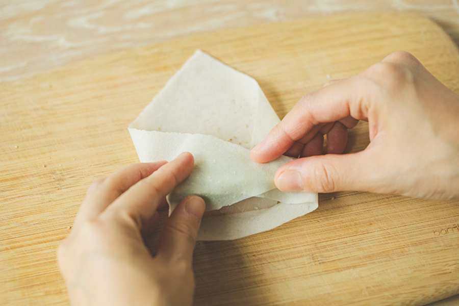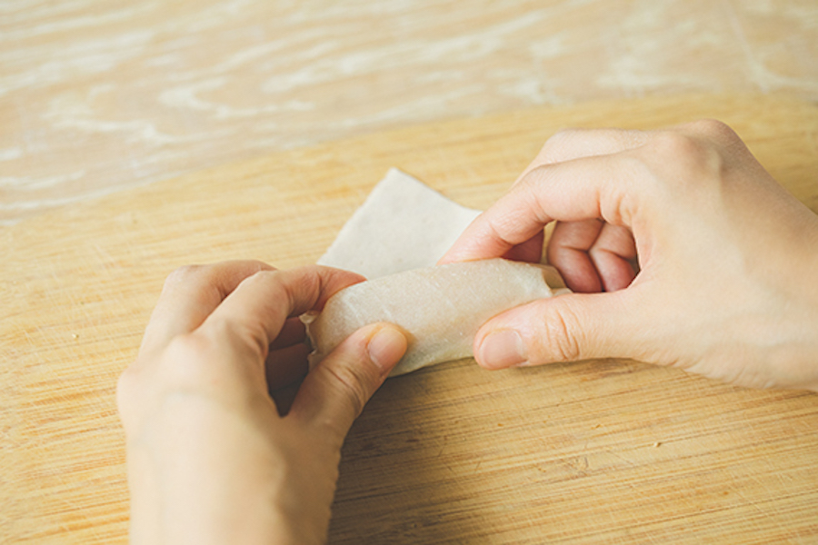 具材をのせたら、左右の皮を真ん中に向かってそれぞれ折りたたみます。
