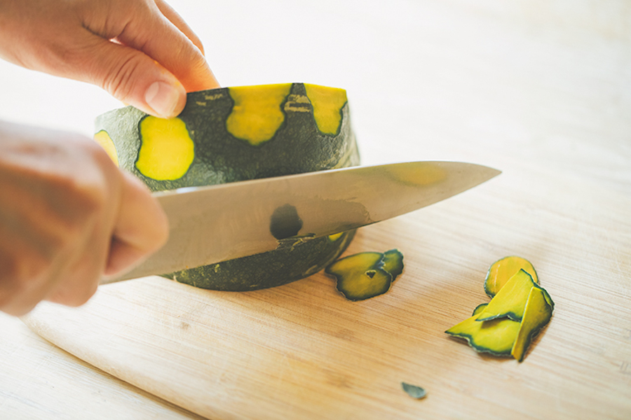 かぼちゃは皮をところどころ包丁で薄く切り落とすと、火が通りやすくなります。