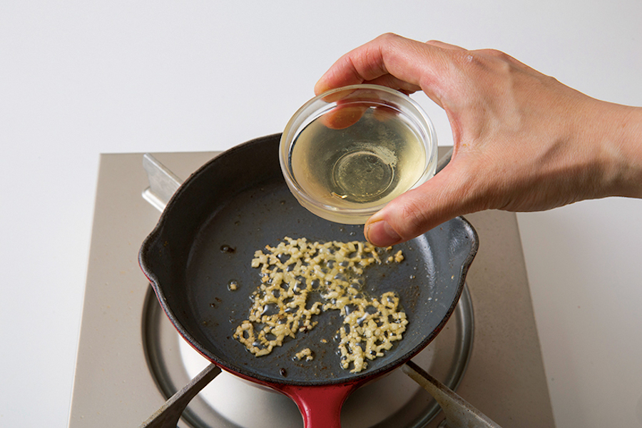 【4】【3】のスキレットをペーパータオルで軽くふき、中火でにんにくを炒め、香りが出てきたら白ワインを加える。