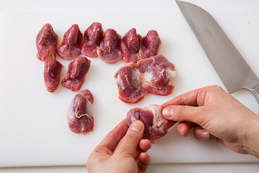 白い筋を取って柔らかく仕上げる。切り目を入れてから白い部分を手で引っ張る。