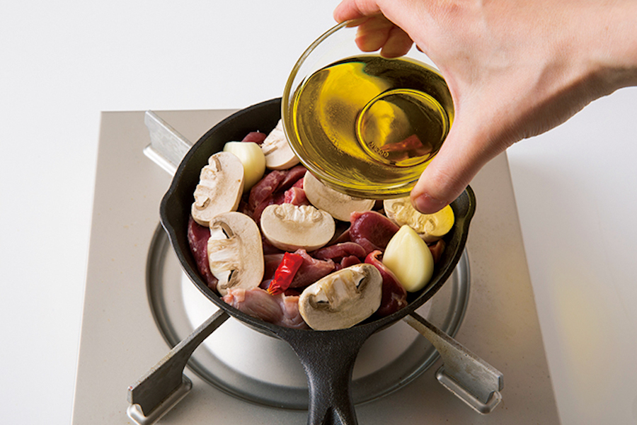 砂肝を並べ、マッシュルーム、にんにく、赤唐辛子をのせ、塩をふって油を注ぐ。