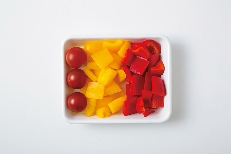 【2】プチトマトはへたを取る。パプリカは種を取り、2cm角に切る。