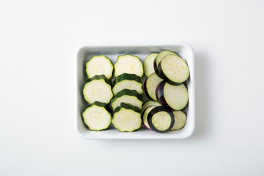 【1】ズッキーニ、なすはへたを取り、7mm厚さの輪切りにする。