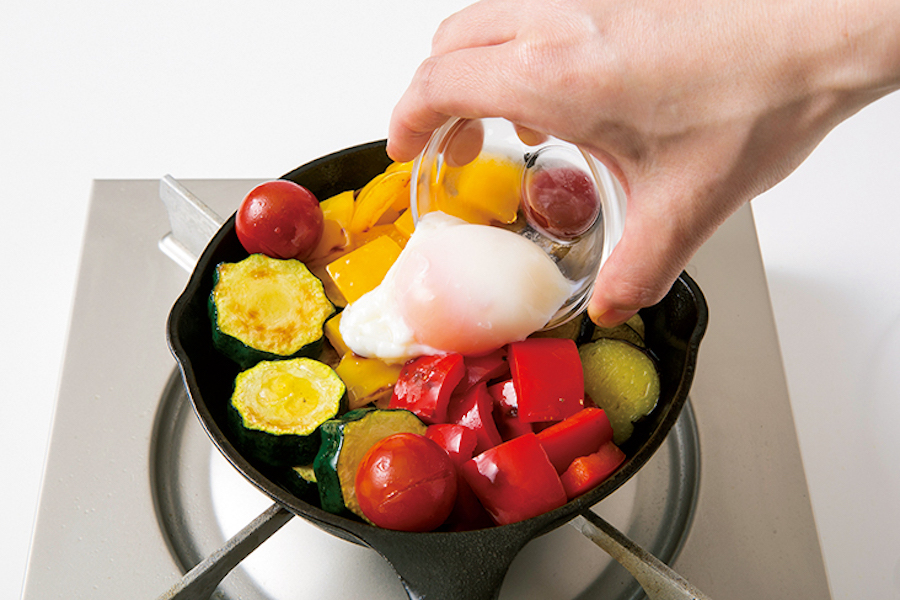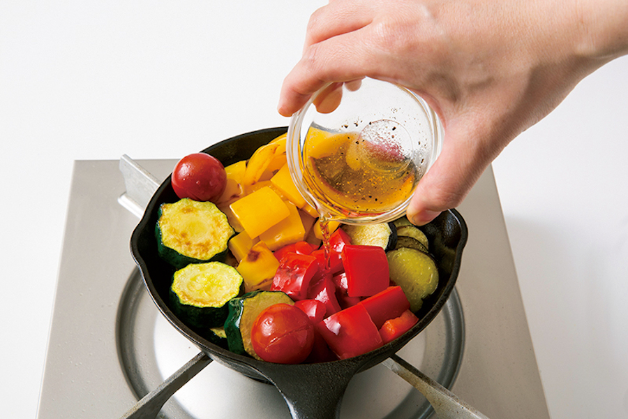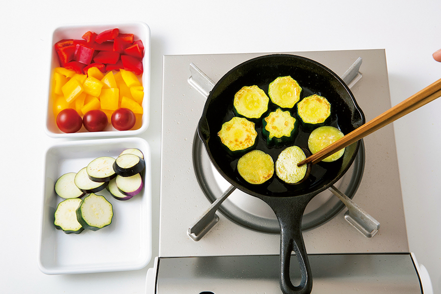 今回は、見た目も鮮やかな「グリルサラダ」をご紹介。シンプルな野菜のグリルは、スキレットの本領発揮メニュー。香ばしい焼き色とじっくり引き出された甘味が最大の調味料になります。