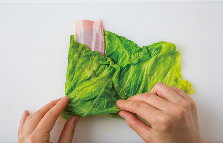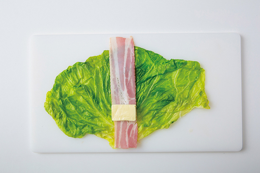 キャベツの中央にベーコンを縦にして置き、手前にチーズをのせる。手前から1回巻いたら左右を折りたたみ、さらに巻く。