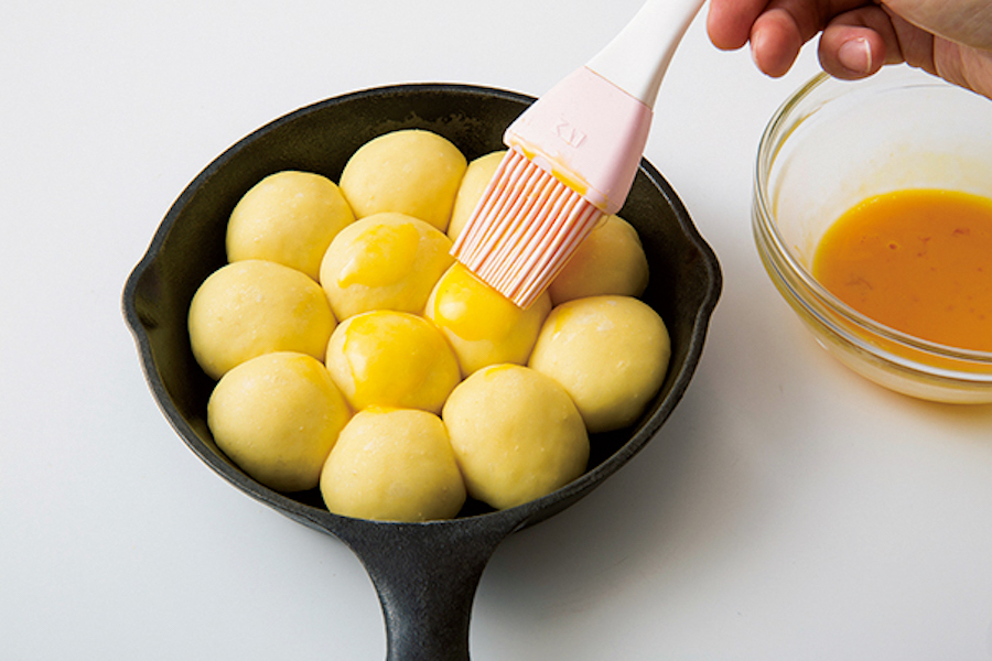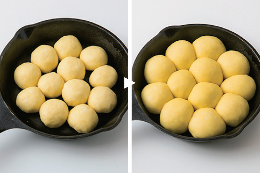 【4】生地を12等分に分割して手で丸め、閉じ目を下にしてスキレットに並べる。