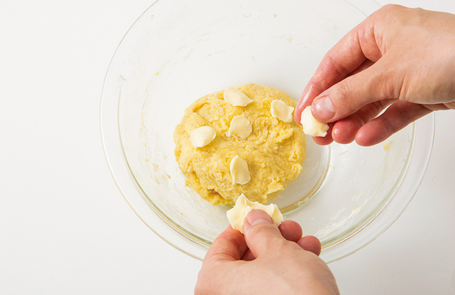 【1】[A]のボウルに[B]を加えてゴムべらで混ぜ、バターを少しずつちぎって加え、混ぜ合わせる。