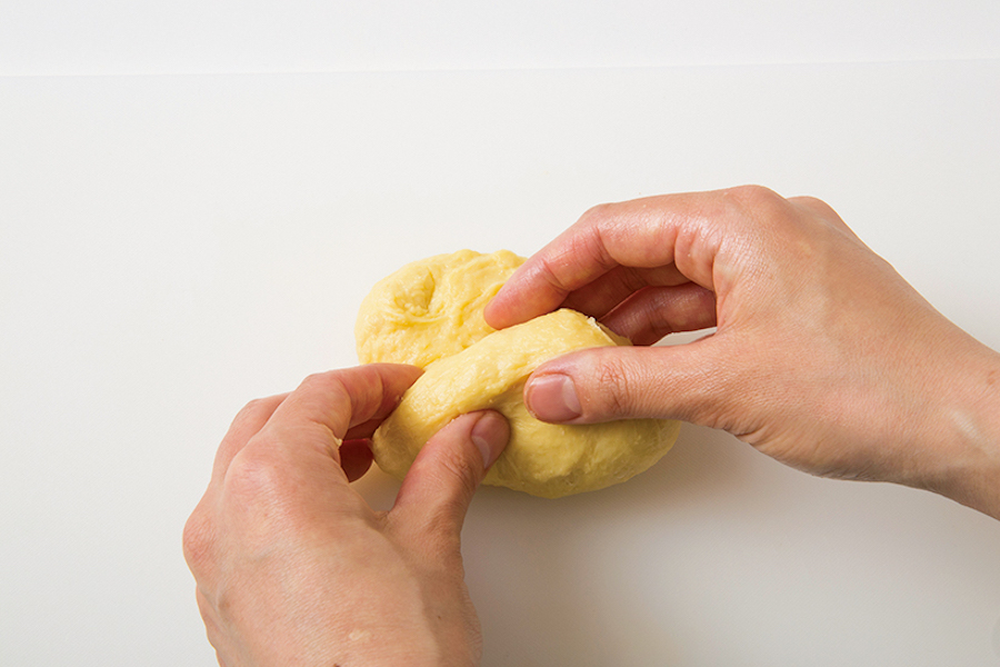 【2】ひとまとまりになったら台に取り出し、表面がなめらかになるまで折りたたむようにしてこね、丸める。