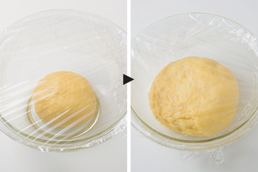 【3】ボウルに生地を入れてラップをかけ、25~30度の温かいところに置き、2倍くらいにふくらむまで1時間ほど発酵させる。