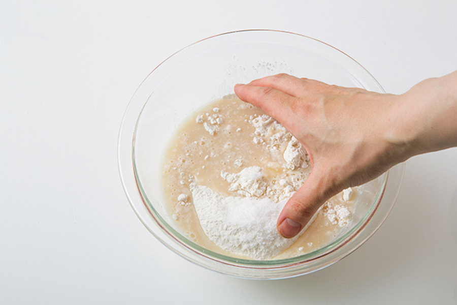 【1】強力粉、砂糖、塩を合わせてボウルにふるい入れ、合わせた[A]を加え、手でよく混ぜる。