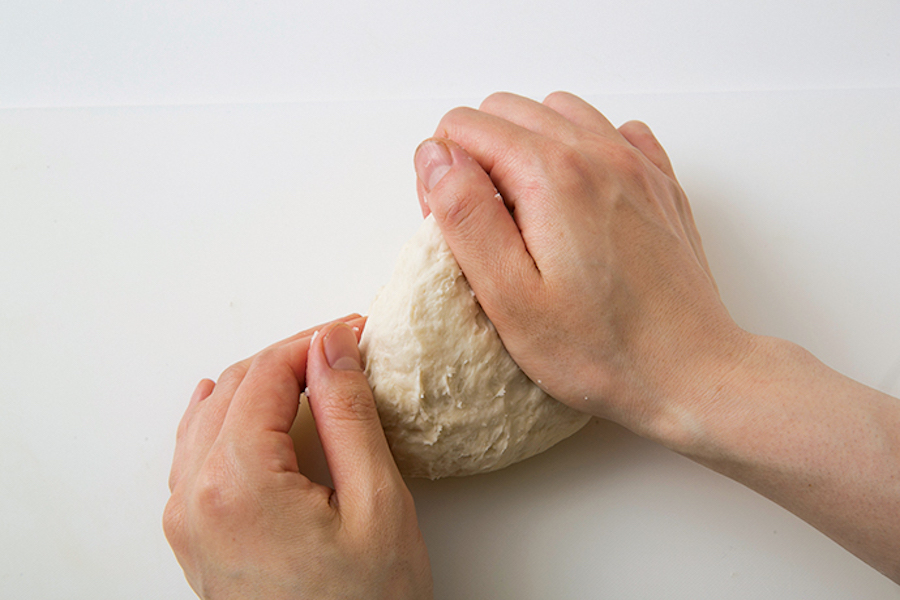 【2】ひとまとまりになったら台に出し、手で折りたたむように表面がなめらかになるまでこねる(10分くらいが目安)。