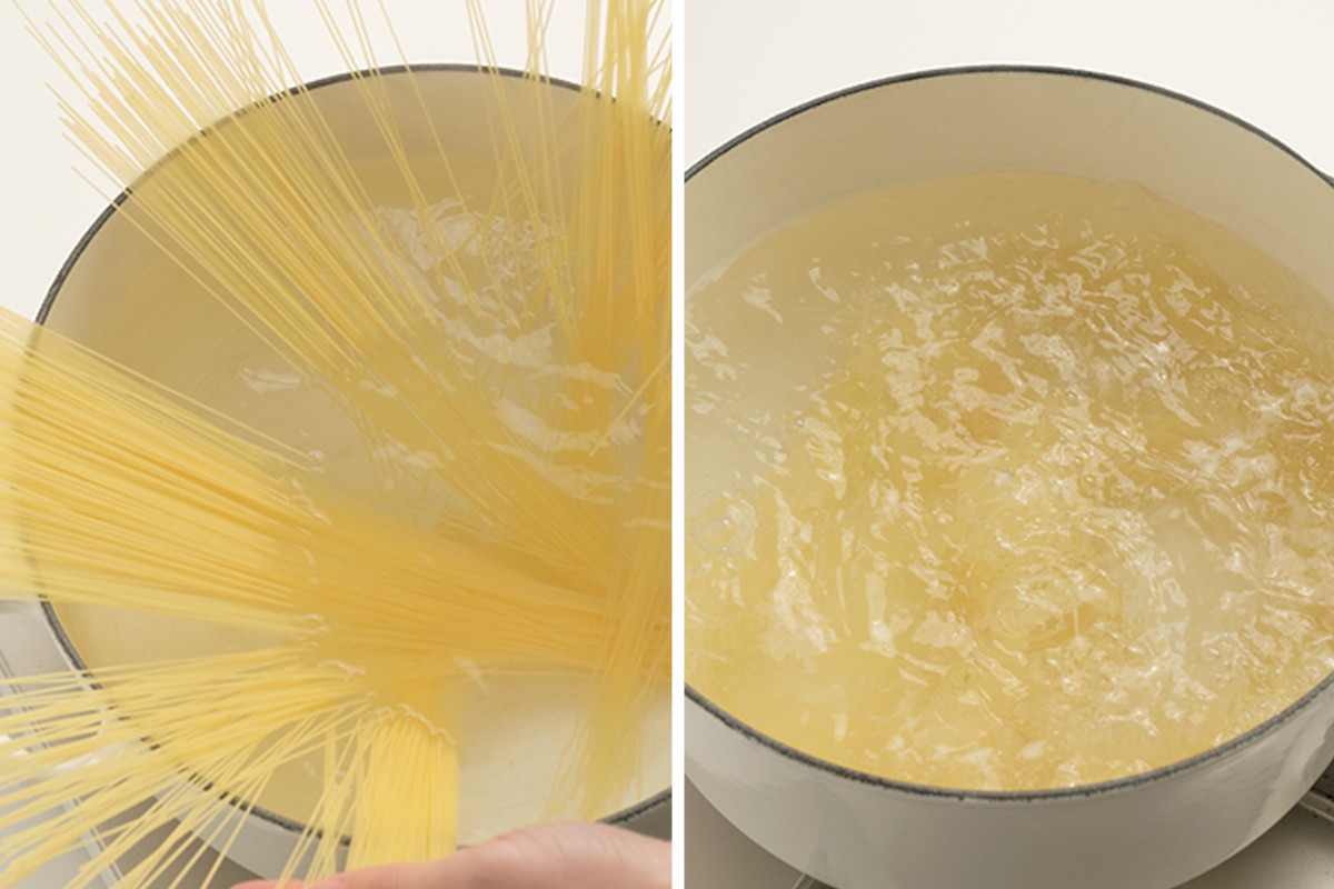 【2】長めにゆでる:パスタを放射線状に広げて入れ、トングなどで混ぜ、袋の表示より30秒~1分長めにゆでる。