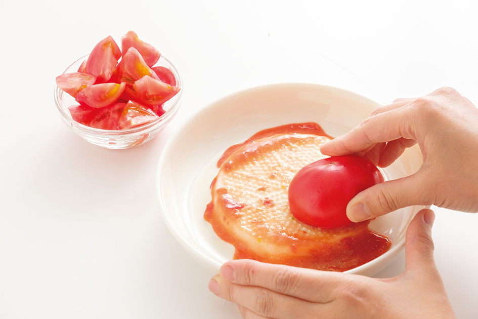 トマトは半量をくし形切り、残りはすりおろして麺にからみやすくする。2つの異なる食感が楽しめる。