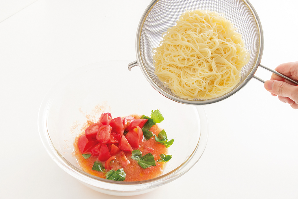 冷製パスタは、袋の表示時間よりも長めにゆでるのがコツ。もみ洗いはしない。