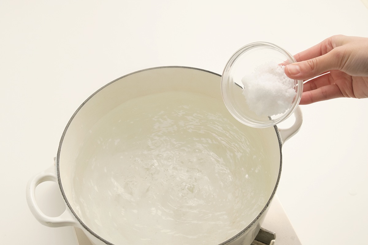【1】湯を沸かす:たっぷりの湯を沸かし、塩(湯1Lに対して10g)を入れる。