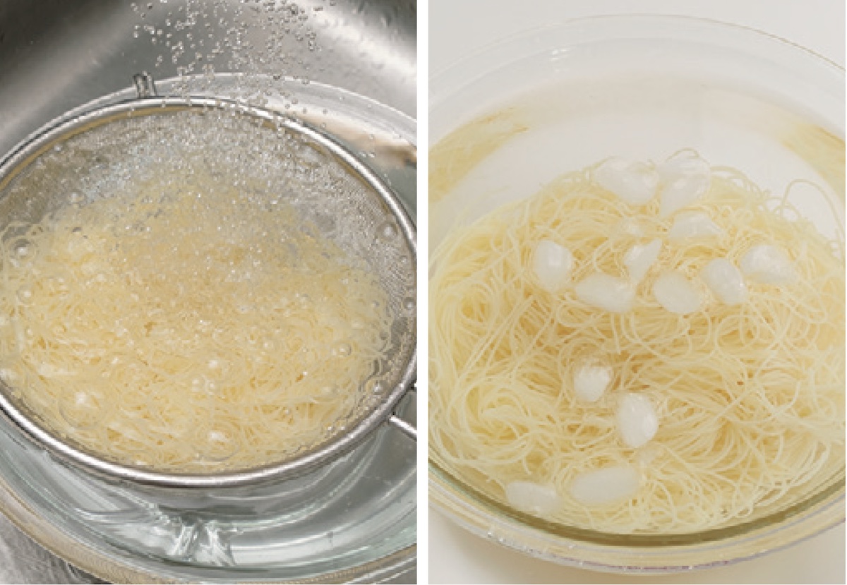 【3】冷やして水気をきる:ざるにあけて流水で粗熱を取り、氷水に取って冷やし、水気をしっかりときる。