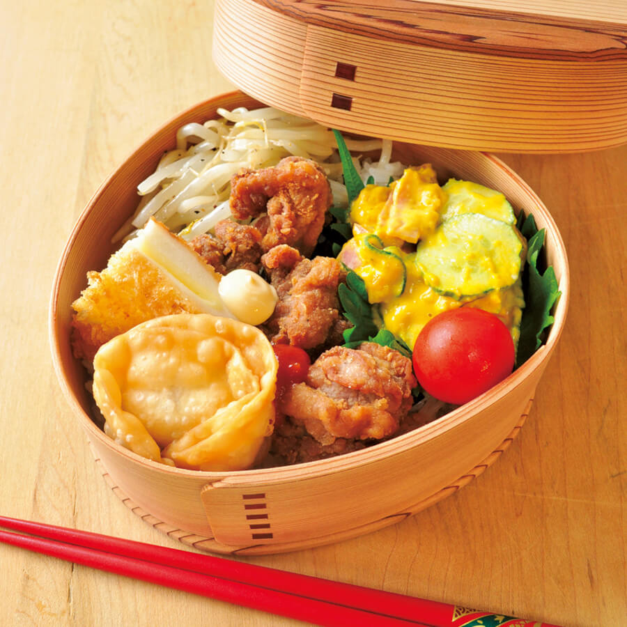 今回は、子どもから大人まで大人気のおかず「から揚げ」が主役の、『から揚げ弁当』をご紹介。衣に卵を入れると時間が経ってもかたくならず、外はカリッと、中はふんわりとした食感が保てる。朝から揚げものをするのは大変なので、夕飯で作るとき、お弁当用にも揚げておくとラクチン。あとで味を変えられるように下味は 最小限に。他のおかずは、卵焼き、からし菜とちくわとえのきのコールスロー。