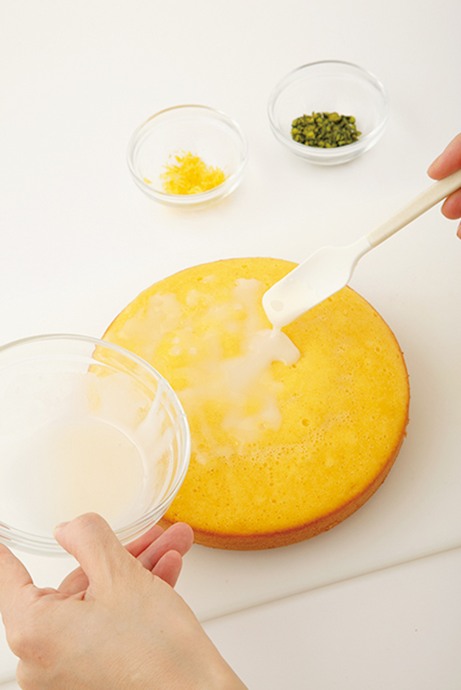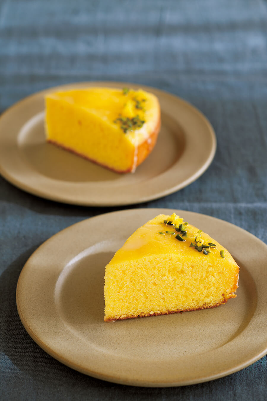 ▲バターを使わず、オイルで作るケーキはしっとり、軽やか。レモンの皮とピスタチオをトッピングし、彩りよく仕上げる。