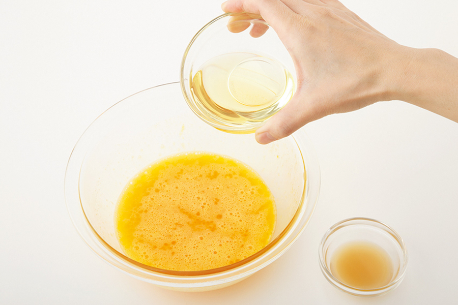 溶いた卵と砂糖を泡立て器でよく混ぜ、米油、レモン汁の順に加えては混ぜる。