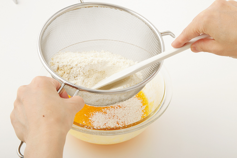 [A]を合わせ、ふるいを通して【1】に加え、粉っぽさがなくなるまでゴムべらで混ぜる。