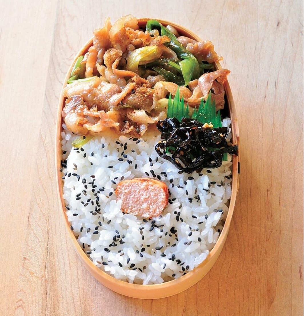 長ねぎを加えた肉野菜炒め。しょうゆ、みりん、砂糖の甘辛味はご飯が進む! たらこと昆布のつくだ煮をのせれば完成!