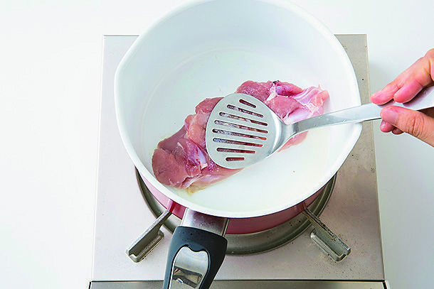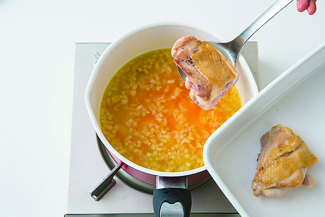 香ばしく焼いた鶏肉を鍋に戻し、肉のうまみをスープに移す。加熱は2回に分けて、具材に均等に火を通す。