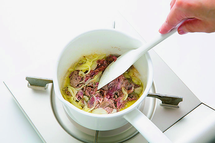 2.鍋にオリーブ油を熱し、玉ねぎを入れて炒める。しんなりしたら牛肉を加えて炒め、色が変わったら残りのを入れ、さらに炒める。