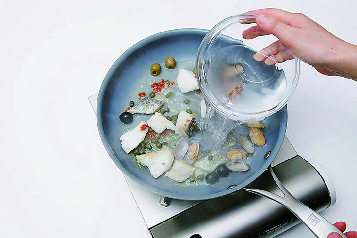 ブイヨンを使わず、水で魚介のうまみを引き出すアクアパッツァ。魚を焼きつけ、具を軽く炒めてから水を加えます。