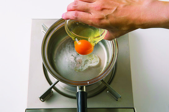小さい容器に割り入れた卵を、渦のできた湯の中に1つずつ落とすと卵が回転してきれいな形に仕上がる。玉じゃくしなどでそっとすくい、余計な熱が加わらないように、手早く冷水に取る。
